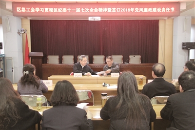 3月17日,区总工会召开学习贯彻区纪委十一届七次全会精神专题会议。会上,区总工会党组书记、主席李会增与程文广等副主席以及机关各部室负责人与主管主席分别签订了2016年党风廉政建设责任书,全面落实从严治党。