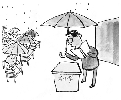 因为山村小学教学楼顶漏雨,河南省方城县郭庄小学一名小学生写了同班同学打伞在教室听课的让人心酸的作文。媒体报道后,引起了方城县教育局和柳河中心小学等领导的关注。相关负责人昨日一早赶到郭庄小学,查看漏雨的教学楼,并称已列入翻修计划,放假就修,并谢绝了热心网友的捐款。(12月28日《郑州晚报》) □王铎
