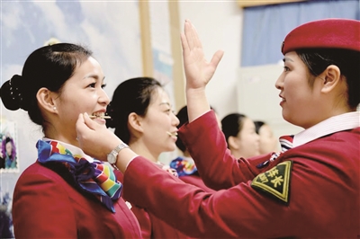 为迎接2017年春运,南昌铁路局南昌客运段针对春运期间旅客运输需要,积极备战春运,做好客运服务人员的素质提升,用最美的微笑迎接2017年春运。图为南昌客运段的动姐咬筷子练习微笑。