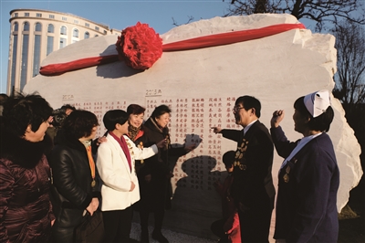 新闻回放:12月28日,在北京市明城墙遗址公园,又增添一道新景观——北京劳模墙正式落成。5块自然形状巨石打磨成的墙体分散坐落在公园西侧草坪上,上面镌刻着北京市建国以来的1197名全国劳模的姓名。全国总工会副主席、书记处书记阎京华出席揭幕仪式并讲话,北京市人大常委会副主任、市总工会主席牛有成致辞。首都劳模代表以及职工代表、工会干部200多人参加了揭幕仪式。