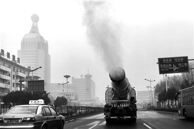 1月2日,山东省气象台连续发布大雾橙色预警与霾橙色预警,山东大部地区仍将维持中度到重度霾天气,部分地区有严重霾。图为一辆降尘车在济南市经十路上进行降尘作业。 新华社发