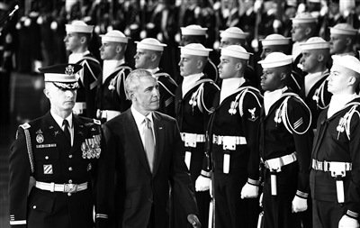 1月4日,在美国首都华盛顿附近的迈尔·亨德森军事基地,美国总统奥巴马(前左二)出席军方为他举行的欢送仪式。当日,美国国防部长卡特和美军参谋长联席会议主席邓福德为即将卸任的美国总统奥巴马举行欢送仪式。