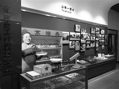 台秤、柜台、糖果……在纪念馆中,一处重现张秉贵工作现场的展示,引来不少参观者的驻足。虽然只有几样简单的陈设,但这些实物却仿佛有种魔力,将人们一下子拉回到上个世纪张秉贵还在柜台前忙碌的日子中。
