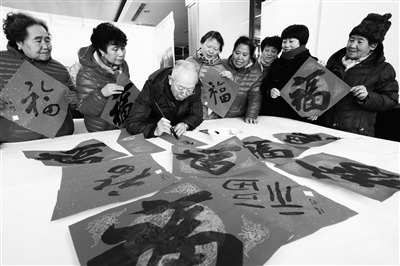 本报讯(记者 陈艺)8日,14位书画家和120余位军地书画爱好者来到丰台区南苑街道,为居民写春联、送福字。