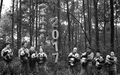 1月11日,中国大熊猫保护研究中心2016年出生的8只大熊猫宝宝集体亮相,为即将到来的新春佳节增添喜庆。图为在中国大熊猫保护研究中心雅安碧峰峡基地拍摄的工作人员和大熊猫宝宝。 新华社发