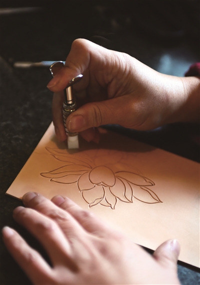 她所制作的皮雕作品共分六大门类,不仅有笔筒、皮鞋、腰带、卡套等人们日常使用的皮制品,还有一大部分是皮雕画艺术品。孙淑娟桌上摆着的一张雕有牡丹的皮质品吸引了记者的注意,牡丹色彩艳丽、姿态优雅,与其他作品不同的是,这幅画中的牡丹花与背景皮层是分离的,花瓣翘起增加了这幅作品的立体感,宛若一朵真花呼之欲出。记者问道:“这些花瓣是粘上去的吗?”孙淑娟笑道:“很多人都这么说,其实这是我用刀雕出来的。我们作为手艺人就应该有过人之处,这是我参加今年举行的北京市第四届职业技能大赛设计的,在一毫米的皮子上做雕刻就挺难的,再挑出立体效果更难了。”