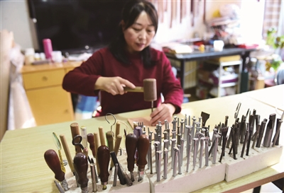 除去在工艺技法不懈追求外,孙淑娟还希望让皮雕工艺得到更多人的传承。孙淑娟告诉记者,她的老师曾告诉她,做皮雕入门门槛很高,不仅皮子贵,整套工具买齐得十多万,“但如果这么多钱的话就不会有人来学。”孙淑娟说:“所以我教徒弟入门都只需要150元的基本工具就可以学习,而我自己的几百件工具总共也只需要6000元左右,这样成本一下就降到一般人也能接受的程度了。”孙淑娟笑着告诉记者:“我不做‘器械党’,我就想用最简单的工具做出最好的效果。”