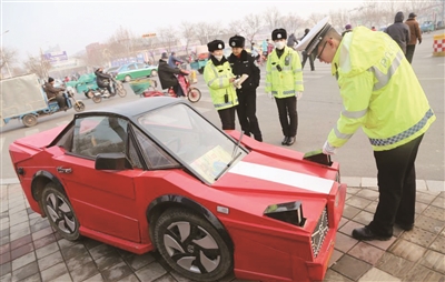 2016年12月30日,山东德州交警直属一大队民警在湖滨路与东方红路交叉口附近执勤时,查获一辆无牌的“电动轿跑”。民警发现,该车雨刷、后备箱、前车大灯样样齐全,令人惊叹的是该车是驾驶员焊接组装而成。随后,民警依法对该拼装车采取了强制报废。