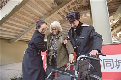 春运中带大包的旅客多,老人孩子也很多,他们能够顺利上下车,才能确保列车准点运行。在记者采访当日,就有一位84岁的老太太从天津乘车来到北京,在从列车员手中搀过这位老太太后,康学伟立刻告知素萍服务组的工作人员推运轮椅,并从站台休息室搬过椅子让这位老太太坐下,同时安慰老太太不要着急,在这位老太太坐上轮椅被推出站台的时候,她不断地说:“真是谢谢你们,好人啊。”