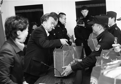 13日,海淀区总工会主席李国祥、海淀公安分局政委刘少波等,来到海淀保安分公司为保安员赠送了慰问品,红红的包里装着北京特产和一封慰问信。海淀保安分公司第一项目部经理、全国劳模朱良玉说:“我们将以崭新的精神面貌和高昂斗志,辅警做好社会治安防控工作。”本报实习记者 赵思远 通讯员 田文江 摄影报道
