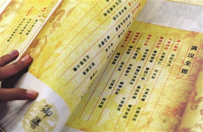 在御膳饭庄的菜谱上,可以看到大满汉和小满汉两套菜单,同时推出了精品体验席。高、中、低价位,食客可以根据自己的需要自由拼点。