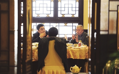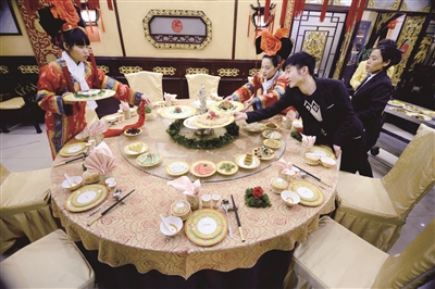 御膳饭庄太和殿包间内,替代熊掌的驼掌、造型精美的功夫菜蛤蟆鲍鱼、鳐鱼肉翅装入华贵的福寿餐具和银器,一一上桌儿,服务员穿上格格服、花盆底鞋各就各位,工作人员和特邀佳宾一一品尝点评。这是正式推出满汉全席前最后的试菜会。