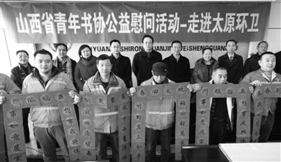 1月17日,山西太原,山西青年书法家协会的书法家们到太原市环卫局慰问环卫工人,并现场书写春联,赠送防雾霾口罩,祝愿他们春节快乐。(1月18日中新网)