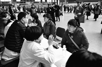 1月18日上午,北京西站联合北京各大医院专家在车站北二楼大厅西侧举办了以“平安回家路”为主题的义诊活动,引来众多旅客驻足参与。据悉,此次义诊活动分为两部分,首先从18日上午九位医学专家开展集中义诊;其次19-22日还将持续开展为期4天、每天一名医学专家的专题义诊,惠及更多的春运出行的旅客,为旅客送去健康祝福。(1月19日中新网)