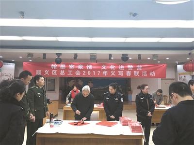 一贴贴喜庆的福字,一幅幅写满春节祝福的春联,一张张洋溢着节日喜气的笑脸……1月16日上午 ,在顺义区大孙各庄镇薛庄村委会,300多名一线职工聚集在一起,原来,一年一度的送春联活动正在进行,来自区总工会的书法家一早就赶来为职工义写春联,送上春节的祝福。