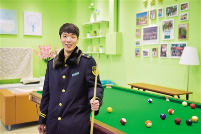 工作后,只要有时间,范远谋就会拿起球杆,来到球案旁打上一会心爱的台球。“我们站区的这个职工之家特别棒,配置了台球案,可以让我们在工作之余放松心情。” 范远谋说。去年年底,他还和站区的其他同事一起参加了地铁系统组织的台球比赛。“虽然战绩不佳,但是我们也总结了不少心得。”