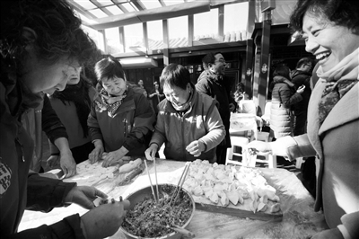 图为辖区居民给职工包饺子。于佳 摄