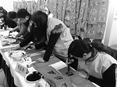 “这次新春送祝福活动,学员们积极性都特别高,大家希望让更多的居民享受到工会的文化福利。”书画班的胡文成老师介绍,自从2013年书画班成立以来,已经带领职工学员参加了7场下基层送文化活动,来到乡镇、村庄、社区多个地方。
