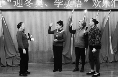 1月20日,朝阳区奥运村街道12个社区冬奥英语培训班的学员聚集在一起,参加冬奥英语展示会,用话剧展示学习成果。