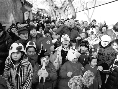 “春来了,春到了!”戴着鸡年头饰,拎着灯笼的小男孩小女孩,跟着身着红衣、手持小锣的春官、春吏,从东四九条胡同出发,走街串巷高声报春。