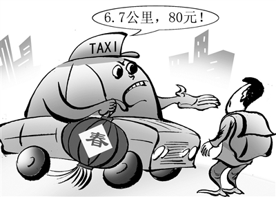 春节假期结束,空寂多日的成都也逐渐恢复往日的人气,客运站、火车站、机场、各大景点纷纷迎来客流高峰。但随着客流增多,一些出租车也开始坐地起价,不仅不按章打表实行“一口价”,价格还“宰你没商量”。近两日,记者就此接到多起市民投诉,称在火车站等地遭遇霸王“春的”(指出租车春节期间议价乱收费现象),有乘客6.7公里的行程,被收一口价80元。(2月3日《成都商报》)□陶小莫