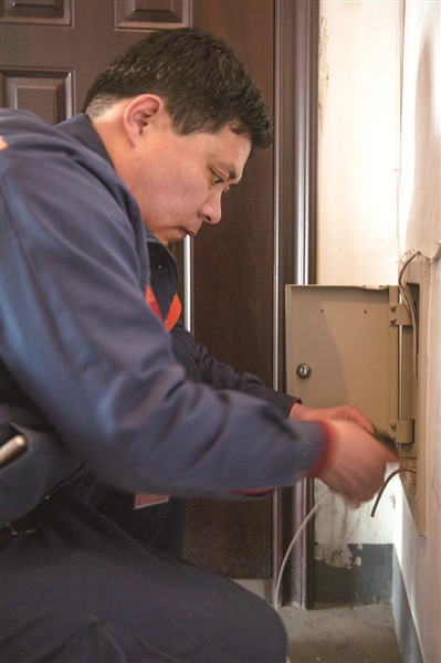 9点30分,庞建宁来到昌平龙兴园中区2号楼一户人家。“您好!我是联通清河分局装维工庞建宁,是为您安装宽带网的。”说完他套上鞋套,从工具箱里拿出尺子开始丈量布线。