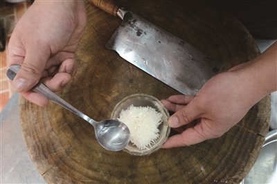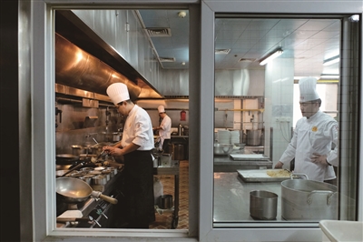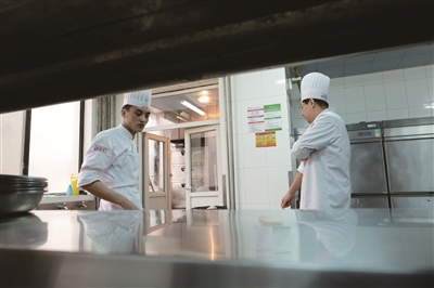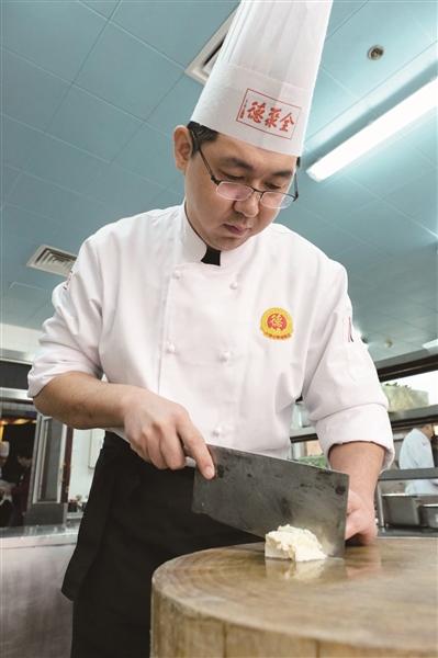前几天,刚从国外执行任务回来,苑双灏就走进后厨又操练起他的“菊花豆腐”,只见跟随了他17年的这把刀在寸方的豆腐上来回飞舞。“这都不算什么,苑师傅在技能表演时都是蒙眼切的,那更能看出手艺。”苑双灏的同事们在一旁打趣地说着,而平日里不太善于言谈的苑双灏憨厚地笑了。