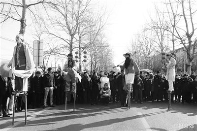 此次展演内容包括高跷、秧歌、舞龙、小车会、抖空竹等丰富多彩的文化活动。只见十几个“高人”各个浓墨重彩、身穿彩衣,扮渔翁、樵夫、渔婆、公子等相穿行于观众身边,这些演员加上脚底的“腿”有3米多高,演员一招一式,一颦一笑甚是逗乐,引得观看表演的群众纷纷举起手机拍照录像,留下精彩瞬间。