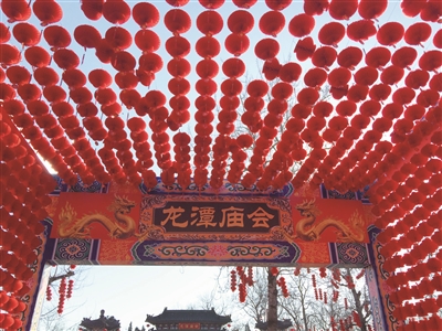 庙会是古老的传统民俗文化活动,也是北京过年的主要习俗。大年初三上午10点半,在接近龙潭湖公园的路上,已经看到不少涌向庙会的人群。站在公园西门对面的马路上,远远地就可以看到一片用红色灯笼装饰的庙会大门。