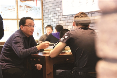 记者看到,有桌客人是一家六口、三代人一同前来品尝的。“我孙子从小就好这口,现在他在外地上大学,这两三年过春节,我们一家人都会出来吃顿暖呼呼的火勺,热闹热闹。今天看到店里好多客人都是家人一起来吃,我看着也挺高兴的。”已经年过七旬的周奶奶向记者说道,“火勺是用大烤炉爆烤而做成的。烤炉内的大铁板像一层层的抽屉,火勺就放在铁板的排排圆状凹口里,因为不停火地对火勺翻烤,火勺就外酥里嫩了。这可是其他城市都没有的。”