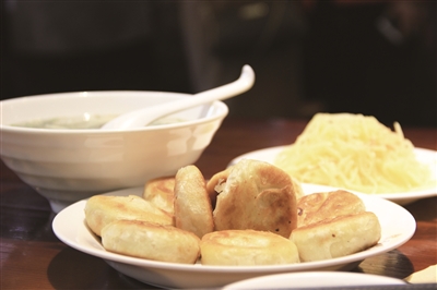 金黄的香酥牛肉火勺,搭配一碗羊汤,再搭配一小盘土豆丝凉菜,就着米醋咬一口,牛肉馅的香一下子充满整个口腔,顿觉等座的时间值得了,而一桌桌亲朋好友之间的气氛,在特色美食的装点下更显其乐融融。