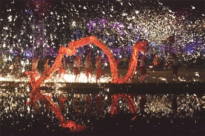 春节期间,国家级非物质文化遗产“火龙钢花”亮相武汉欢乐谷,上演“人在龙中舞,龙在火中飞”的奇观。来自重庆的表演者把温度高达1500℃的铁水掺杂着特制的干花拍打至高空,瞬间空中“流星”飞舞,赤膊露背的舞龙者则在“铁水流星”下翻转腾挪,场面蔚为壮观。