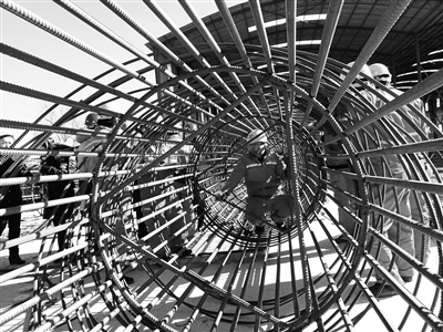 来自辽宁的农民工袁国春今年48岁,加工钢筋已有8年,大年初七他就来这里给孩子挣学费。“这一个钢筋笼七八人一起绑扎,绑好后由机械转运吊装放入桩孔做好加固措施,再灌注混凝土,最终成为桥梁桩基础,做的是最基础的工作。但到了这里才知道很多人春节在岗位过年。”