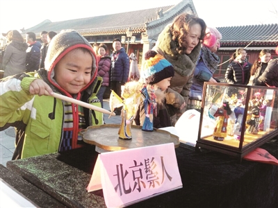 北京皮影、北京鬃人、药香、玲珑枕、蜡果……当天的活动现场,还有不少非物质文化遗产项目的展示。其中,最受小朋友欢迎的无疑就是北京鬃人了。