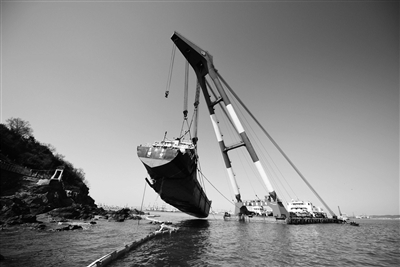 2月26日,“烟救起重2号”浮吊船对“同兴9”货船进行起吊作业。当日,经过交通运输部烟台打捞局700吨级浮吊船“烟救起重2号”数个小时的起吊作业,搁浅在山东省烟台山景区的“同兴9”货船被成功打捞,解除了其对烟台港进出港航道的碍航影响。2017年1月30日凌晨,“同兴9”货船在烟台港芝罘湾港区码头避风期间,因大风吹断缆绳而失控,顺风漂流至烟台山景区北侧并搁浅在礁石上,事故未造成人员伤亡。 新华社发