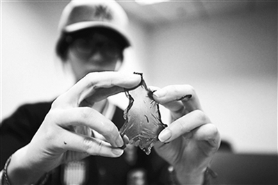 北京市食品安全监控中心吴燕涛博士介绍道,“检测结果显示,在外观上,紫菜和塑料袋断面微观形貌就具有明显差异。紫菜的断面结构复杂,两侧分别有两层薄膜,中间夹着排列整齐的一个个紫菜细胞,而塑料袋的断面结构致密,只有剪切时留下的撕裂痕迹,没有复杂的多级结构。”