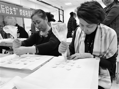 握住裱花袋,用力猛地向上拔起来,一个曲奇饼干就做好了。7日,朝阳区制造业工会举办“三八”妇女节烘焙活动,邀请专业的烘焙团队为基层工会的女职工现场指导。每名女职工都制作了属于自己的曲奇饼干,享受着烘焙的乐趣。
