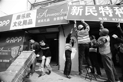 现场,公安、城管、城建等多部门联运,施工人员将一幢黄色居民楼由西向东逐一拆除了招牌、灯箱、玻璃门。屋内存放的物品并没有受到影响。在楼前,已经准备好水泥、沙子、砖头,拆除门牌后立刻进行封堵填充,恢复原貌。