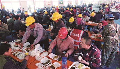 工程项目部党支部书记王建忠介绍,工程高峰期施工人员达到6700人,现场要安排两个分餐区,才能满足施工人员早、中、晚就餐。