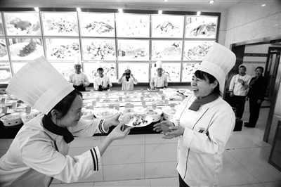 “师父,请点评!”近日,卢沟桥地区总工会辖区独立建会企业志欣大连海鲜举办了一场拜师会,于柏娟将自己新学的金鱼花型水饺捧到面点主厨赵丽艳跟前,请赵丽艳点评。花型合格,赵丽艳才收于柏娟为徒。