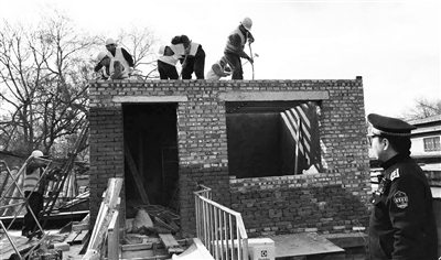 位于安定门柴棒胡同某院的居民擅自在自家平房顶上搭建起砖瓦结构的二层违建,墙刚砌起一半,就被城管队员发现,在责令劝阻自拆无效的情况下,城管部门依法对违法建设予以拆除。同样,在北新桥九道湾北巷,一处20平方米新生二层违法建设刚刚搭起结构就被城管发现并依法拆除。