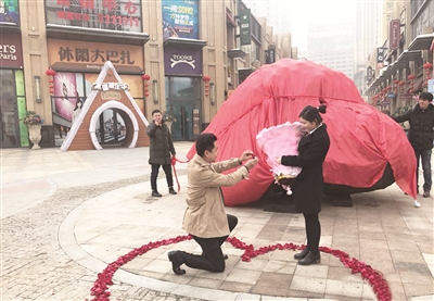 乌鲁木齐市一男子用百万元购买33吨“陨石”,向女友求婚成功。3月14日,站在乌鲁木齐市某广场一块大“陨石”旁的小伙刘飞向女友王芳芳求婚,引来多位市民围观,在大家的见证下,女孩答应小伙的求婚。