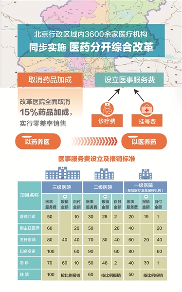 《北京市医药分开综合改革实施方案》4月8日起正式实施,全市3600余家医疗机构将设立医事服务费,全部取消药品(不含中药饮片)的加成和挂号费、诊疗费。同时,435项医疗服务项目价格“一升两降”、药品实行零差率销售……那么,我们的就医环境会有哪些变化?看病就医费用是否会增加?报销流程是否有变化?有疑问如何咨询?市卫计委等部门相关负责人对此进行了解读。