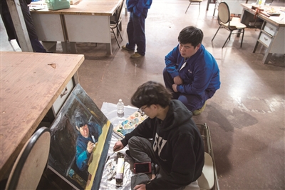 国画系同学王少泽对汽车生产线产生了浓厚兴趣,“虽然汽车天天坐,工人们的服装是一样的,但他们每个人身上都散发着不同的气息。我的作品就想利用汽车方向盘作为作品元素,表现同样一件工作服下不同工人的面孔。”