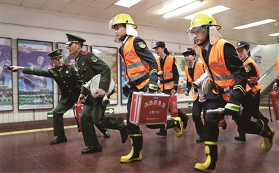 随着指挥员一声令下,地铁10余名消防队员手持灭火器材迅速奔赴火灾现场。这是3月22日在地铁1号线王府井站区天安门东站,由站区职工和北京武警某部第10支队2中队的战士共同开展的消防演练。