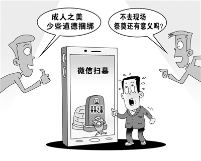 指尖轻触,哀思关山飞渡;打开微信公众号,约定时间输入密码,就能观看祭扫现场直播……最近,成都、南京等地先后推出的微信祭扫活动,引发舆论热议。“不去现场祭扫,清明节祭奠还有意义吗?”“微信祭祀一旦成风,是否会使人们疏于亲情”,面对质疑,也有很多人力挺这一祭祀方式,认为这是成人之美,希望少一些道德捆绑。(3月27日新华网)□朱慧卿