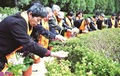 清明临近, 近日在河北平山县古中山陵园生态节地葬区,20个家庭在此举行了免费集体花葬和树葬仪式。据了解,此次活动以公益花坛葬和树葬为殡葬新理念,倡导节俭、绿色、环保的文明祭扫新风尚。图为花葬现场,亲友们撒花瓣,寄托哀思。