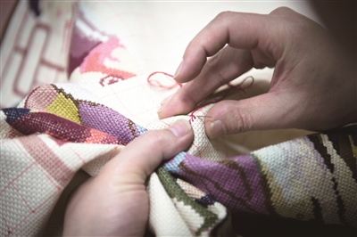 绣十字绣最让孟飞感到心焦的是绣线打结,以及看图纸后绣跑格,尤其是在开始的时候。每当绣错时,孟飞就得先用剪刀剪、再拆下来已经绣上去的绣线,重新对照图纸再绣。“生活里面我有时脾气不是很好,绣十字绣会让我沉下来,处于平静的状态里而不那么浮躁。”