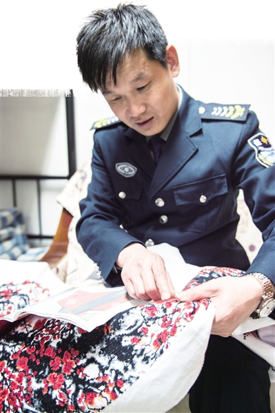 孟飞今年37岁,现任北京市农商银行海淀支行保安队长。每天,6点钟左右孟飞就要起床,准备一天的工作;出完早操后,他会巡查一遍所在支行以及网点;作为队长,他还要负责招收保安队伍人员、岗位培训以及注意事项的讲解。但2010年夏天时,孟飞多了一项新“任务”——绣十字绣。