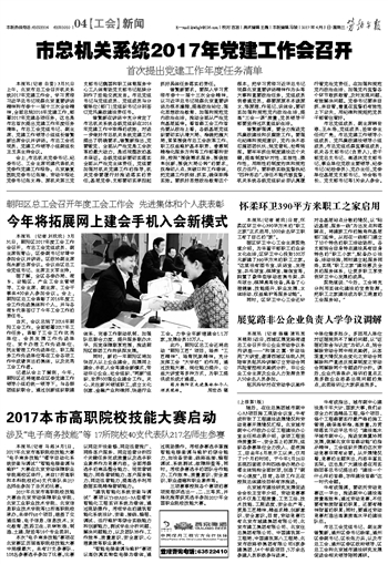 本报讯(记者 白莹) 3月31日上午,北京市总工会召开机关系统2017年党建工作会,学习贯彻习近平总书记视察北京重要讲话精神和市委十一届十三次全会精神,全面总结2016年党建工作,部署2017年党建各项任务,这也是市总首次提出党建工作年度任务清单。市总工会党组书记、副主席、党建工作领导小组组长曾繁新出席会议并讲话。市总工会巡视员、党建工作领导小组副组长王玉英主持会议。